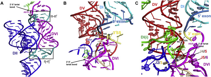 A) The two stems of DII (blue) form a y-shaped structure and two tetraloop-receptor interactions with DVI (magenta), π-π′ and η-η′ shown boxed in cyan. The π-π′ interaction is located very close to the 2′-5′ lariat bond between DI(i) nucleotide G1 (green sticks) and the bulged adenosine of DVI (magenta sticks) [48]. Rendered from PDB: 4R0D.
